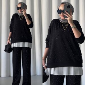 Kristal Taş detaylı modal kumaş ikili takım- Siyah Renk